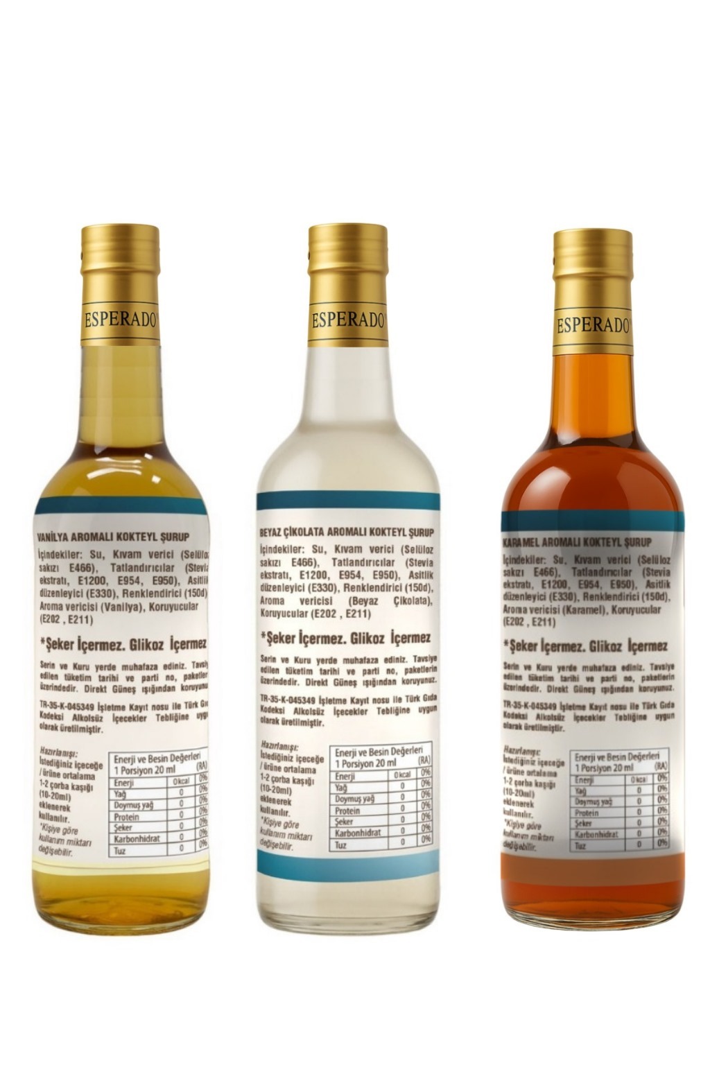 • Esperado – 3 lü kahve şurup seti – VANİLYA-BEYAZ ÇİKOLATA-KARAMEL -Şekersiz – Zero – 3 x 750 ml şekersiz – Kahve & kokteyl şurubu ıçindekiler :Su.Kıvam verici (selüloz sakızı,polidekstroz),tatlandırıcılar (stevia ekstratı,,sodyum sakkarin ,asesulfam k), renklendirici (karamel 150d),doğal aroma vericisi (karamel),koruyucu (sodyum benzoat,potasyum sorbat) aroma ve renklendiriciler ürün çeşidine göre değişiklik gösterir.